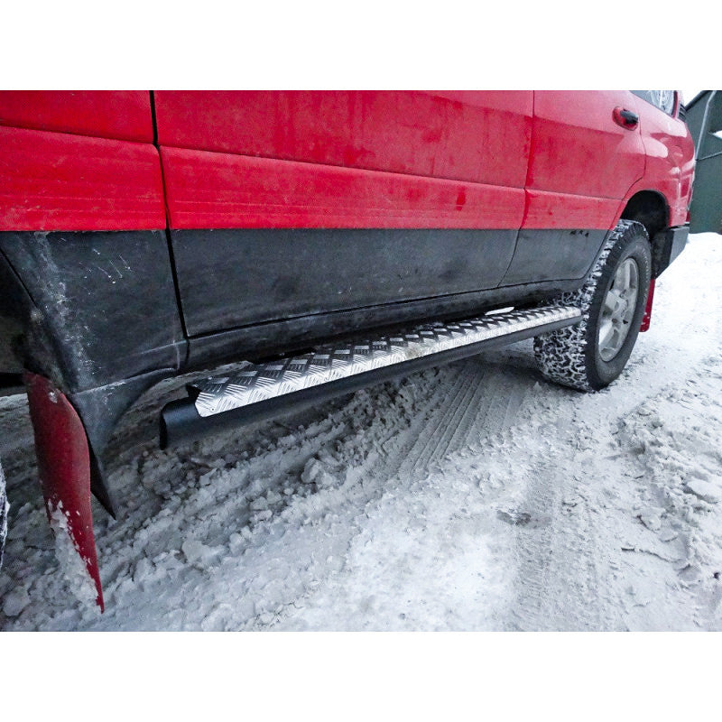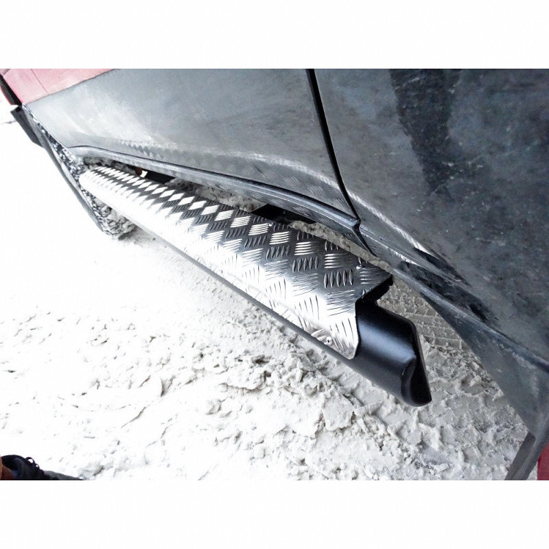 • Aluminiowe wykończenie: Ryflowane aluminium nie tylko nadaje progom elegancki wygląd, ale również zapewnia doskonałą przyczepność, zapobiegając poślizgnięciu podczas wsiadania i wysiadania.