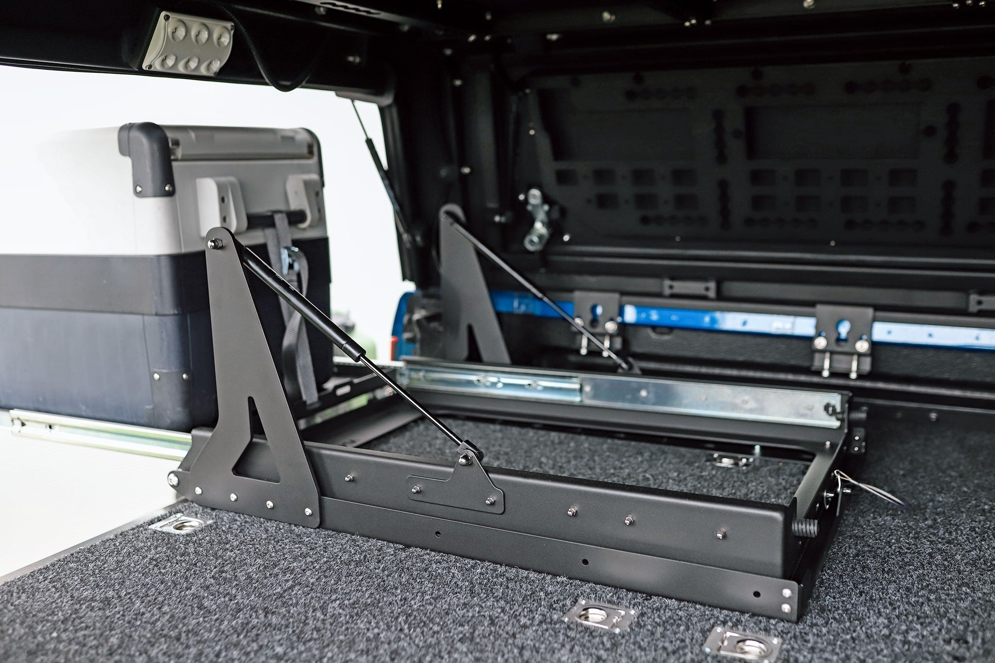 • Opuszczana, uchylna szuflada: Pozwala na łatwy dostęp do lodówki nawet w trudnych warunkach terenowych.