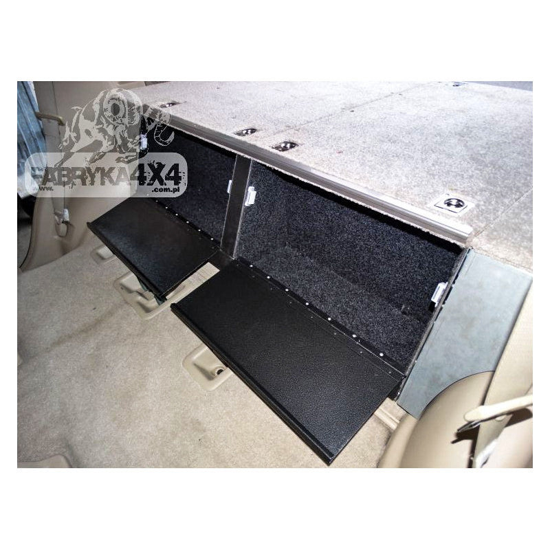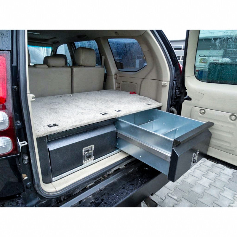 • Estetyczne wykończenie: Fronty szuflad malowane są proszkowo w kolorze srebrnym antycznym, co nadaje całości elegancki wygląd. Górna część wykonana z sklejki pokrytej filcem, zabezpieczona aluminiowym narożnikiem, doskonale komponuje się z wnętrzem samochodu.